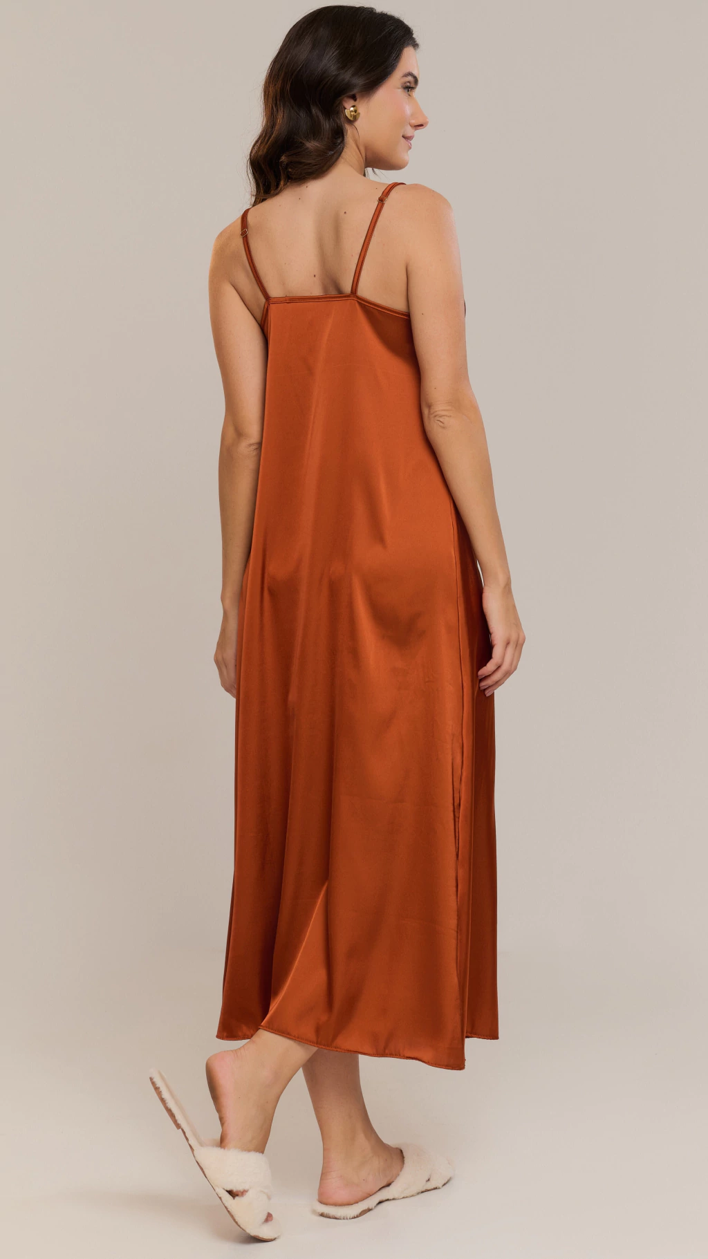 Seu decote degagê adiciona um toque moderno e feminino, enquanto o caimento fluido valoriza a silhueta de forma natural. As alças finas em cetim, com metais banhados a ouro 24k, elevam o acabamento da peça e permitem ajuste perfeito, sem abrir mão da elegância.